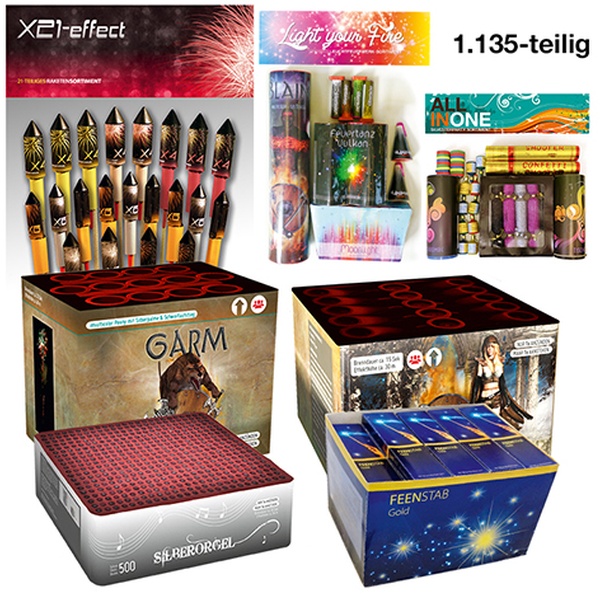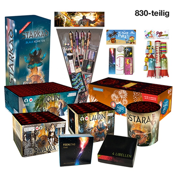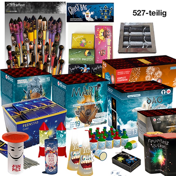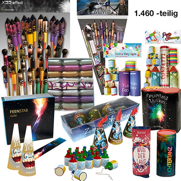 Feuerwerkssortiment 1: Leuchtfeuerwerk mit 1x Starkad (300 Schuss) und 1x 4er Libelle. Systemfeuerwerk mit 1x Idum (110 Schuss) Z-Shaped, 2x Swawa (25 Schuss), 2x Laurin (15 Schuss), 1x Ostara (17 Schuss), 3x Feenstab gold (klein, 17 cm/10er) und 1x Festivalbox 4 (Komplettfeuerwerk) Maximalpower. Kinderfeuerwerk mit 2x Kleiner Pirat (lustiger Kinderspaß). Raketen mit 1x XB 9-effect (9 Bombenraketen im Beutel). Familiensortiment mit 1x Surtr XXL-Familiensortiment. Partyartikel mit 2x Partystimmung (alles für die Party).
