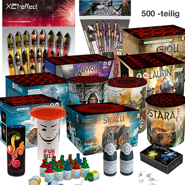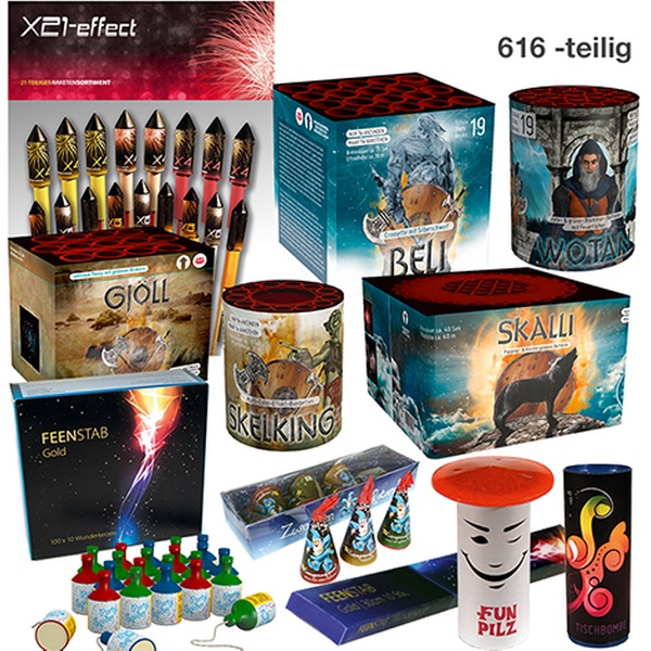 Feuerwerkssortiment 10: Systemfeuerwerk mit 1x Beli (19 Schuss) Cosette, 2x Skelking (13 Schuss), 1x Laurin (15 Schuss), 1x Wotan (19 Schuss), 1x Ostara (17 Schuss), 2x Dag (13 Schuss), 2x Gjöll (13 Schuss) und 1x Skalli (43 Schuss) Supercake. Kinderfeuerwerk mit 2x Zwergenknaller (50er). Raketen mit 2x X21 Effect (Raketen der Extraklasse). Familiensortimente mit 1x Mimir XXL-Familiensortiment. Partyartikel mit 2x Fun Pilz (2er), 1x Partybottle (2er), 1x Partybombe und 2x Party Spider (Partyknaller, 20er).