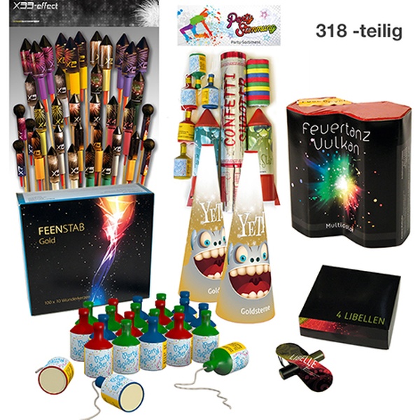 Feuerwerksortiment 4: Leuchtfeuerwerk mit 1x Yeti 2er Schweizer Vulkane und 2x Zwillingsfontäne. Systemfeuerwerk mit Beli (19 Schuss) Cosette, Mart (19 Schuss), Kari (25 Schuss) und Dag (13 Schuss). Wunderkerzen mit 1x Feenstab gold (klein, 17 cm/40er). Komplettfeuerwerk mit 1x Festivalbox 4 (Komplettfeuerwerk) Maximalpower. Kinderfeuerwerk mit 1x Wunderland Kids (Jungen), 2x Zwergenknaller (50er) und 1x Ghost Bag (Kids Party). Raketen mit 1x X33 Effect (Raketen der Extraklasse). Partyartikel mit 3x 2er Fun Pilz, 2x 2er Partystarter, 2x 20er Party Spider (Partyknaller) und 1x 6er-Schachtel (super groß) Knall-Bonbons.