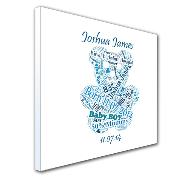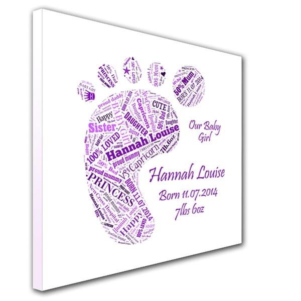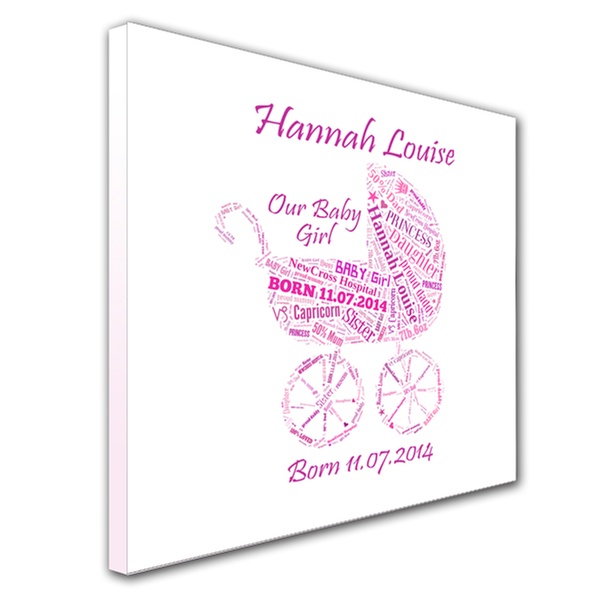 Kunst aus Wörtern in speziellen Baby-Designs, versehen mit Namen und Datum, als persönliches Geschenk