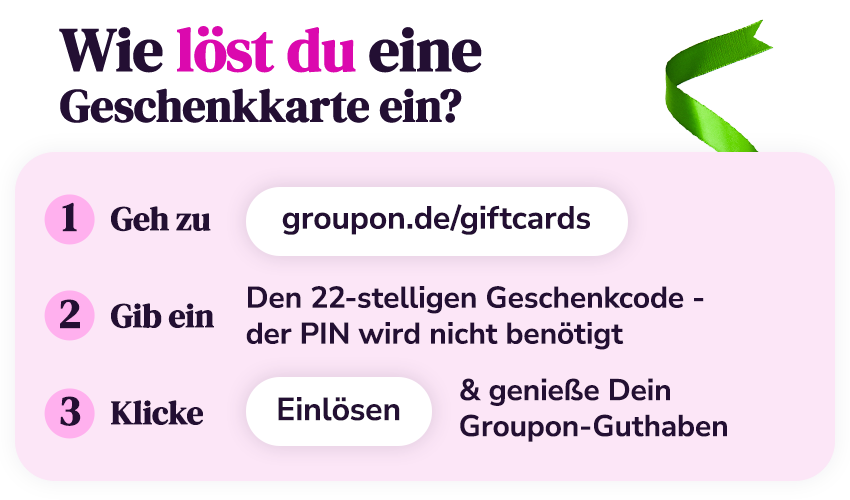 Um den Geschenkgutschein einzulösen, müssen Sie ein bestehendes Groupon-Konto haben oder eines erstellen. Bei der Einlösung wird das gesamte Guthaben der Geschenkkarte auf Ihr Groupon-Konto überwiesen. Geschenkkarten können nicht für den Kauf weiterer Groupon-Geschenkkarten eingelöst werden. Geschenkkarten sind nicht wieder aufladbar und können nicht in mehreren Groupon-Konten eingelöst werden.