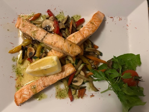 - Gegrillter Lachs – Aromatisch gegrillter Lachs mit einem Spritzer Zitrone, dazu ein frisches Salatbouquet und goldbraune Bratkartoffeln