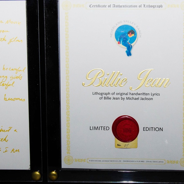 www.billiejean-lyrics.com bietet Fans des King of Pop ein ganz außergewöhnliches Sammlerstück. Die original Handschrift seines Superhits „Billie Jean“ übergab Michael Jackson 2003 seinem ehemaligen Manager. Im Andenken an seine erfolgreiche „HIStory World Tour“ sollten daraus für jedes Land der gigantischen Tour 100 authentische, hochwertige Lithografien gestaltet werden. In Zusammenarbeit mit Michael Jackson Tokyo Co. LTD konnte dieses Projekt nun verwirklicht werden.