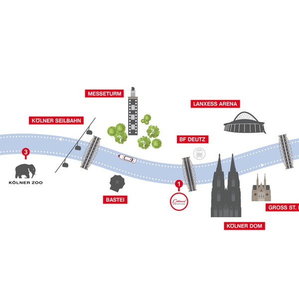 - Altstadtpanorama, rheinabwärts bis Köln-Mülheim, rheinabwärts bis Zoo / Seilbahn