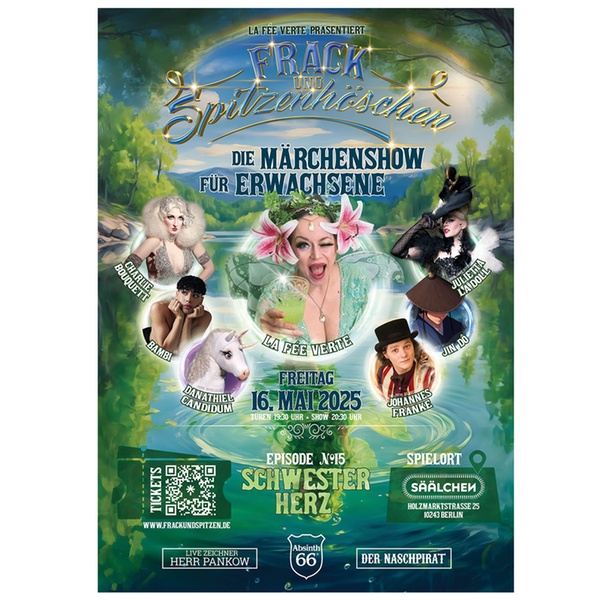 „Frack & Spitzenhöschen“ ist keine gewöhnliche Show – es ist ein wildes Märchen für Erwachsene, das Theater, Varieté und Burlesque mit einer ordentlichen Portion absurdem Humor mixt. Hier begleitest du die grüne Fee La Fée verte und das charmante Einhorn Danathiel Candidum auf eine irrwitzige Reise ins Feenwald-Sanatorium. Freu dich auf hochkarätige Künstler wie Christian von Aster, Fine Seufzer und Majestic Luxor, Live-Illustrationen während der Show und natürlich: ein ordentlicher Schuss Absinth! Professionell produziert, liebevoll inszeniert und garantiert unvergesslich – ein Erlebnis, das du so nur in Berlin findest.