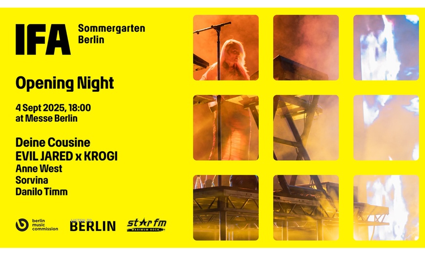 Spür den Puls Berlins unter freiem Himmel! Am 4. September 2025 verwandelt sich der IFA Sommergarten zur Opening Night in ein Festivalerlebnis der Extraklasse. Erlebe kompromisslosen Rock mit Deine Cousine, ein energiegeladenes Crossover von EVIL JARED x KROGI sowie die aufregendsten Newcomer der Hauptstadt wie Sorvina, Danilo Timm und Anne West – präsentiert in Kooperation mit StarFM und LISTEN TO BERLIN. Mitten im Grünen, mitten in Berlin beginnt die IFA 2025 nicht nur mit Technik, sondern mit echtem Sound, Haltung und Gänsehautmomenten.