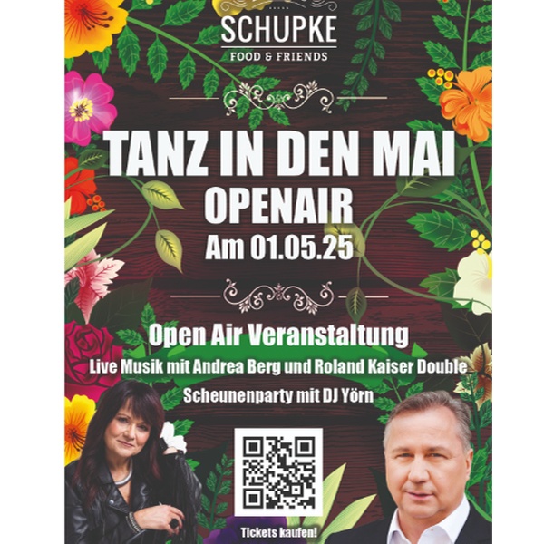 Erlebe einen Abend, der alle Sinne anspricht: Freu dich auf eine mitreißende Open-Air-Veranstaltung mit Live-Acts der Extraklasse – Andrea Berg- und Roland Kaiser-Double sorgen für Gänsehaut-Momente. Danach geht’s weiter in der legendären Partyscheune des Landhaus Schupke, wo DJ Yörn mit 2000er-Hits und aktuellen Beats die Nacht zum Tag macht. An den Grillstationen erwarten dich saftige Steaks, vegane Burger oder Bratwurst-Klassiker – und an der Bar fließt das frisch gezapfte Schupke-Bier in Strömen. Feier mit in den Mai – herzlich, laut und unvergesslich!