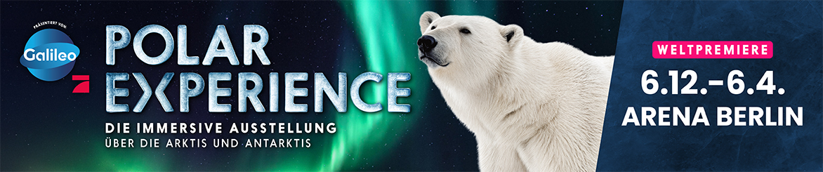 Vom 6. Dezember 2025 bis 6. April 2026 feiert die „POLAR EXPERIENCE – Die Immersive Ausstellung über die Arktis und Antarktis“ ihre Weltpremiere in der ARENA BERLIN. Mit modernster Technik entstehen beeindruckende Projektionen, virtuelle Illusionen und Soundwelten, die die Besucher:innen mitten in die Eislandschaften, Tierwelten und Forschungsexpeditionen der Polarregionen versetzen – von der Expedition des Forschungsschiffs „Polarstern“ bis zur Neumayer-Forschungsstation in der Nähe des Südpols.