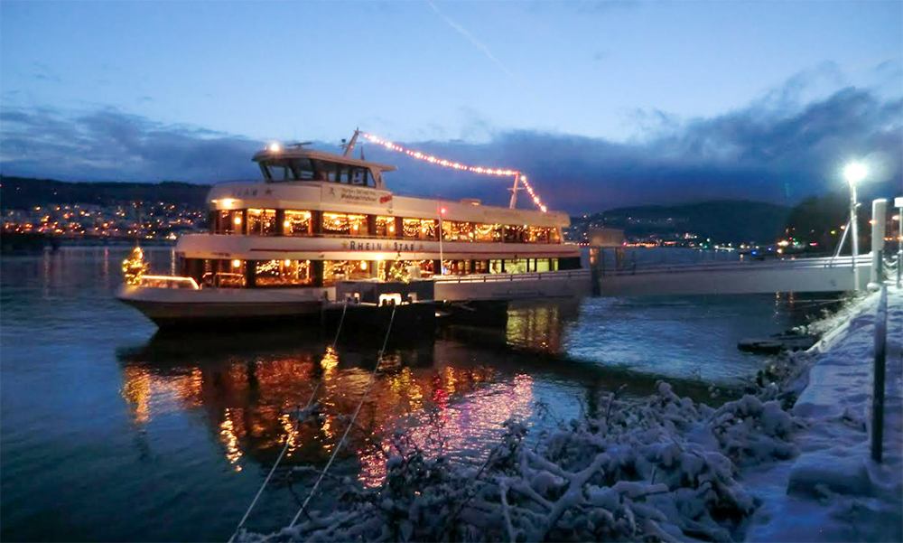 Die von weihnachtlicher Musik untermalte Fahrt durch das UNESCO Welterbe Oberes Mittelrheintal führt entlang von Burgen und Weinbergen