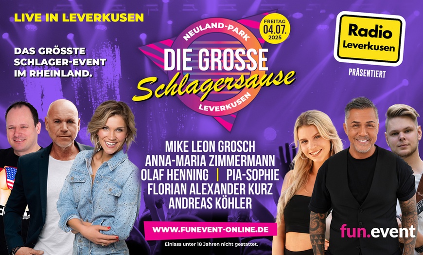 Sichere dir jetzt dein Ticket für das größte Schlager-Event im Rheinland! 2025 feiert das Fun Event seine Premiere im Neuland-Park Leverkusen – mit Stars wie Mike Leon Grosch, Anna-Maria Zimmermann und Olaf Henning. Erlebe eine unvergessliche Nacht voller Stimmung, Gänsehaut und Schlager-Hits. Freu dich auf Food Trucks, kühle Drinks und beste Unterhaltung. Im exklusiven VIP-Bereich wartet erstklassiges Catering auf dich. Ein Event, das verbindet – mit Leidenschaft geplant, professionell umgesetzt und garantiert einzigartig. Lass dir dieses Highlight nicht entgehen und sei Teil eines Abends, der noch lange nachklingt. Jetzt Tickets sichern!