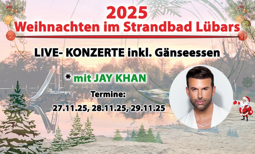 Erlebe die festliche Adventszeit mit einem exklusiven Live-Konzert von Jay Khan. Der Sänger begeistert mit Charme, Leidenschaft und Hits, die direkt ins Herz gehen, und schafft so ein unvergessliches Erlebnis. Im großen Saal des Restaurants im Strandbad Lübars erwartet dich nicht nur ein musikalisches Highlight, sondern auch ein reichhaltiges Gänsebraten-Buffet mit klassischen Beilagen wie Rotkohl, Grünkohl, Kartoffelklößen und Salzkartoffeln. Diese einzigartige Kombination aus Livemusik und Genuss ist ideal für Weihnachtsfeiern mit Freunden, Kollegen oder der Familie. Sichere dir rechtzeitig Tickets und freu dich auf ein Event voller Stimmung und festlichem Zauber.