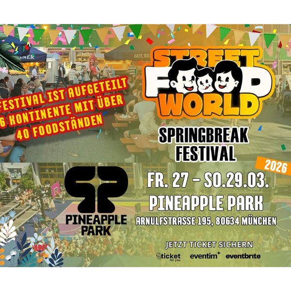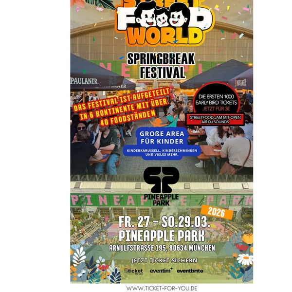 Das Street Food World Springbreak Festival verwandelt den Pineapple Park in ein Paradies für Genießer und Musikliebhaber. Über 40 Foodstände servieren kulinarische Highlights aus allen Kontinenten, während DJs und stilvolle Cocktailbars für ausgelassene Stimmung sorgen. Entdecke hochwertige Entertainment-Angebote, die jedes Festivalwochenende unvergesslich machen. Auch Familien kommen auf ihre Kosten: Eine große Kids Area bietet zahlreiche Attraktionen für kleine Entdecker. Lass dich von internationalen Spezialitäten, mitreißender Musik und einem lebendigen Festivalambiente begeistern und sichere dir dein Ticket für ein Erlebnis, das Kultur, Genuss und Entertainment perfekt verbindet. Ein Event, das dich tanzen, genießen und staunen lässt.