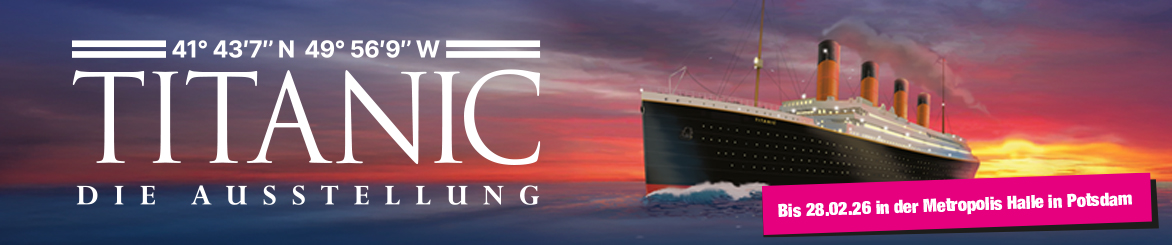 Komm an Bord der Titanic in der Metropolis Halle im Filmpark Babelsberg und erlebe die legendäre Jungfernfahrt der RMS Titanic hautnah. Entdecke die luxuriösen Räume und technischen Meisterleistungen des Schiffes, das 1912 von Southampton startete und in der Nacht des 14. April tragisch mit einem Eisberg kollidierte. Spüre die Dramatik dieser schicksalhaften Stunden und die Geschichten der fast 1.500 Passagiere, die in dieser Nacht ihr Leben verloren. Die Ausstellung lässt die unglaublichen Ereignisse der Titanic lebendig werden und bietet dir die Chance, Geschichte hautnah zu erleben und unvergessliche Momente mit auf die Reise zu nehmen.