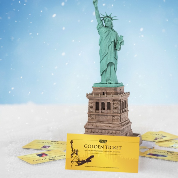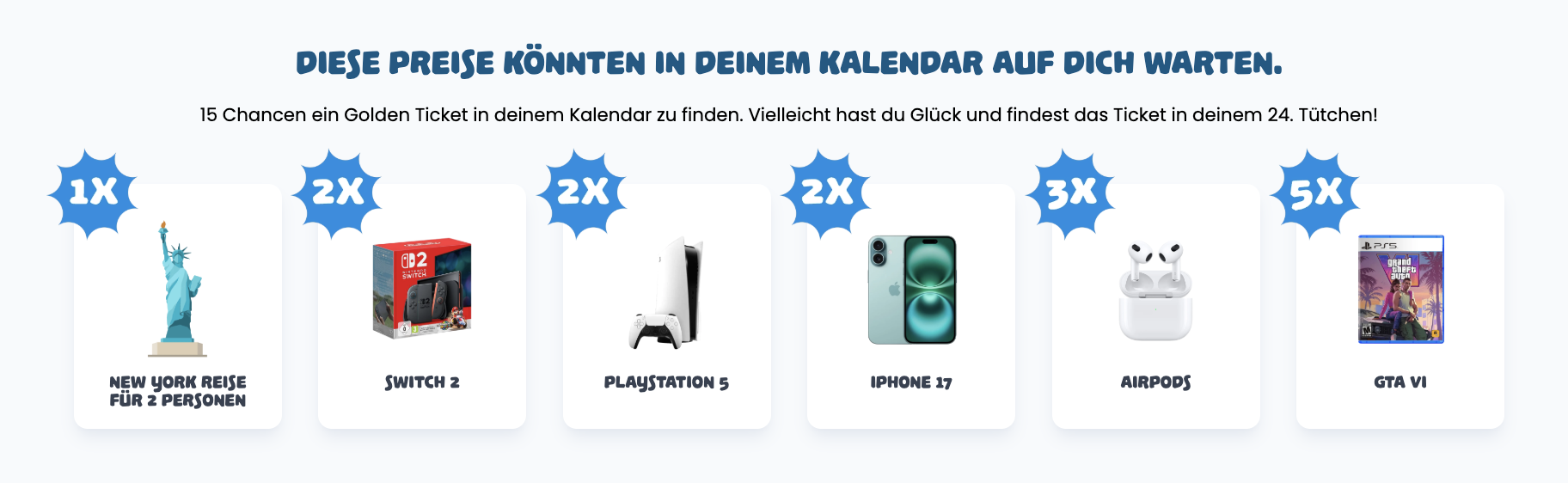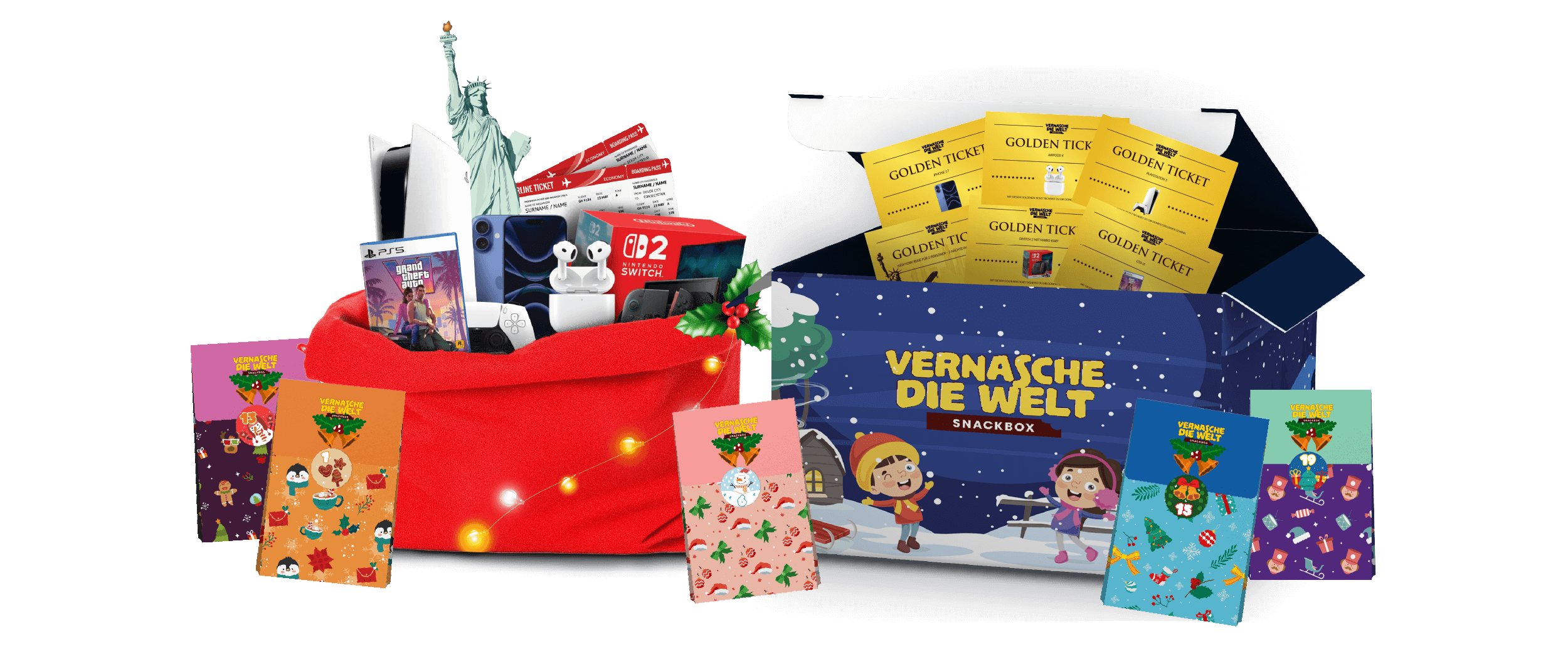 Vernasche die Welt versteckt insgesamt 15 Goldene Tickets in den Adventskalendern. In einem der Türchen könnte also dein Ticket auf dich warten! Mit etwas Glück sicherst du dir damit einen Mega-Preise – zum Beispiel eine Reise nach New York oder brandneue Apple AirPods.