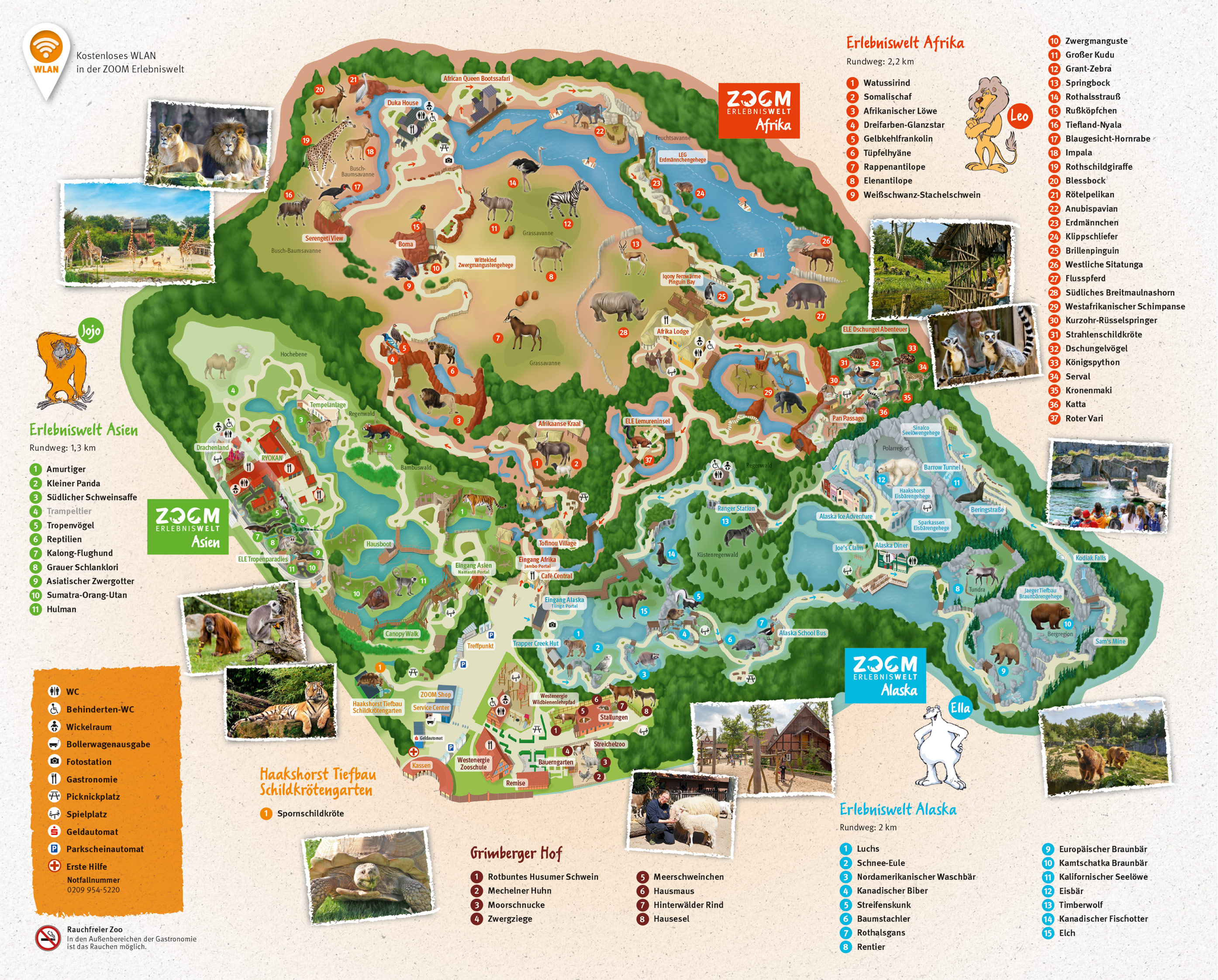 • Die Eingangstore zu den Erlebniswelten Alaska, Afrika und Asien schließen jeweils 30 Minuten vor Zooschließung