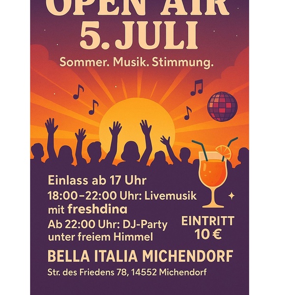 Ob bei der ausgelassenen Sommerparty am 21. Juni oder dem mitreißenden Open-Air-Sommerfestival am 5. Juli – das Bella Italia Michendorf wird zur Bühne für unvergessliche Sommernächte! Dich erwarten Livemusik unter freiem Himmel, angesagte DJs, ausgelassene Stimmung und ein Ambiente wie im Italienurlaub. Am 5. Juli sorgt die großartige freshdina live für Gänsehautmomente, bevor ab 22 Uhr die DJ-Nacht im Saal startet. Am 21. Juni steigt die Sommerparty mit feinsten Beats ab 21 Uhr – inklusive kostenlosem Willkommensgetränk. Zwei Events, zwei Tickets, doppelte Sommerfreude! Bring deine Lieblingsmenschen mit und erlebe, wie sich der Sommer wirklich anfühlt – lebendig, tanzbar und voller Lebensfreude.