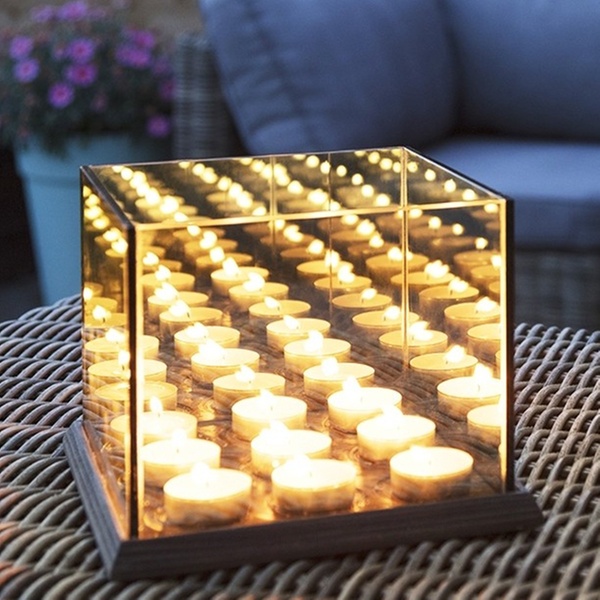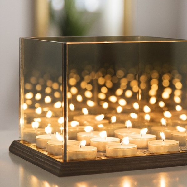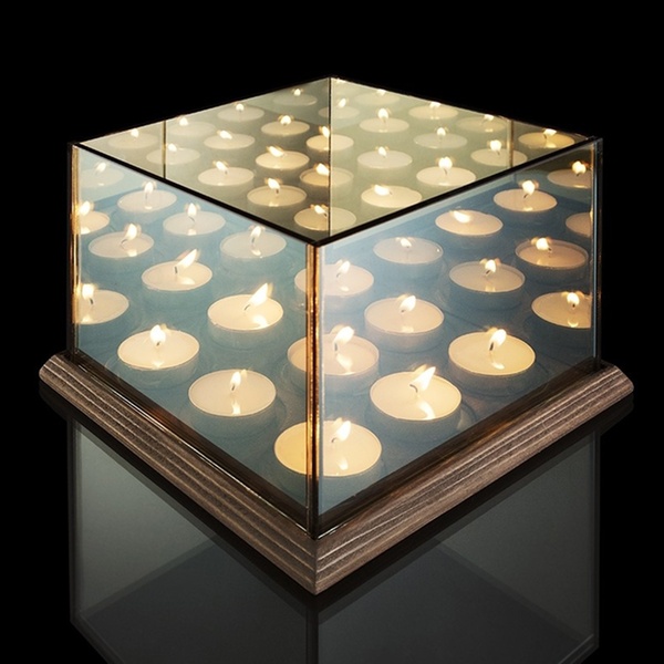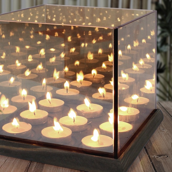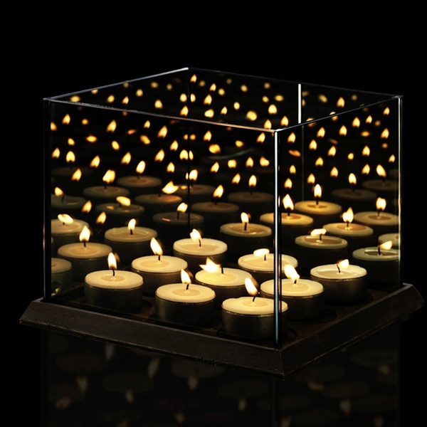 - Stehende Spiegelscheiben im Inneren des Teelichthalters reflektieren den Kerzenschein und erwecken den Eindruck eines unendlichen Flammenmeers