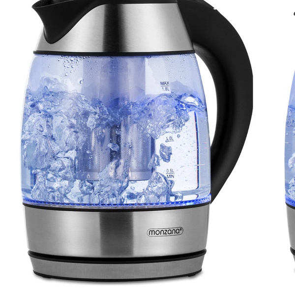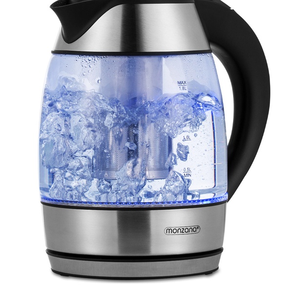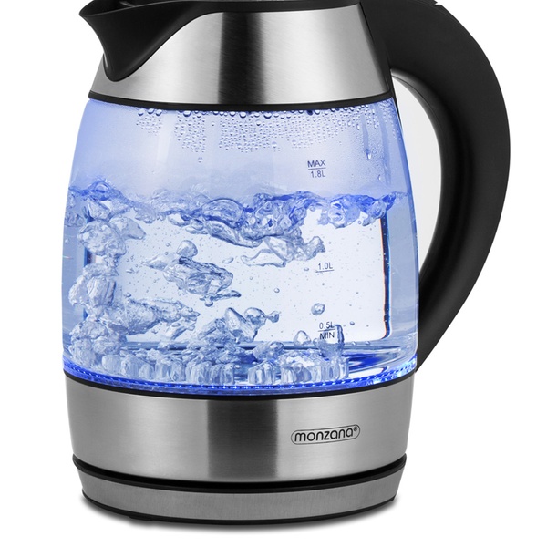 Ein Glas-Wasserkocher mit blauer LED-Beleuchtung, Wasserstandsanzeige und 360°-drehbarem Kontaktsockel für Rechts- und Linkshänder