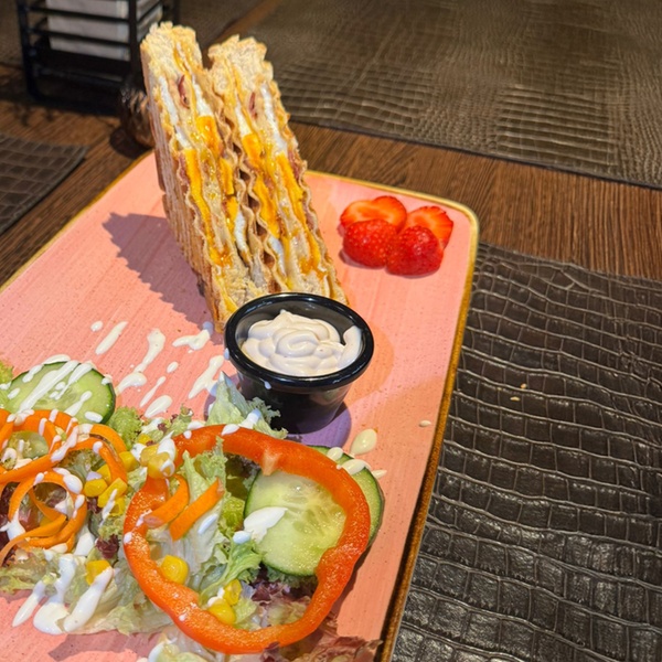 - Godfather Toast: Toast, Ei, Bacon, Käsemix, Cheddarkäse, serviert mit gemischten Salat und einer Sauce nach Wahl