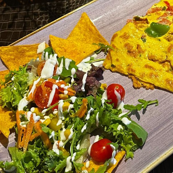 - Fiesta Quesadilla: Quesadilla mit Bacon, ein, Eisbergsalat, Mais, Paprika, Pico de Gallo, serviert mit Sour Cream