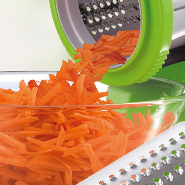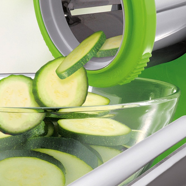 - Mit 4 austauschbaren Klingenpaaren (je 2 Stk.): für dicke und dünne Scheiben und für grobes und feines Raspeln