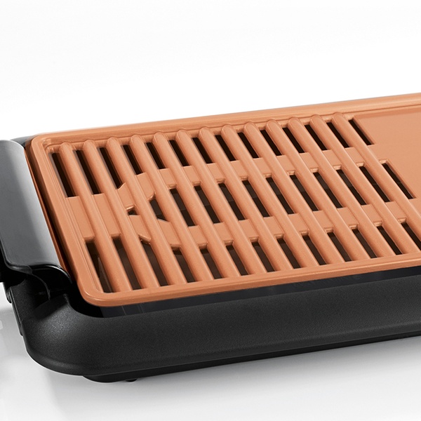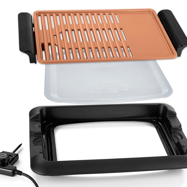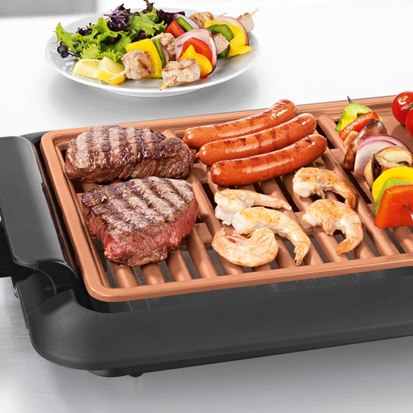 Rauchfreier Elektro-Grill mit Grillplatte mit zwei Garbereichen, Herausnehmbare Auffangschale für Fett sowie Keramik-Antihaftbeschichtung