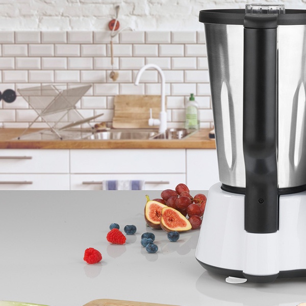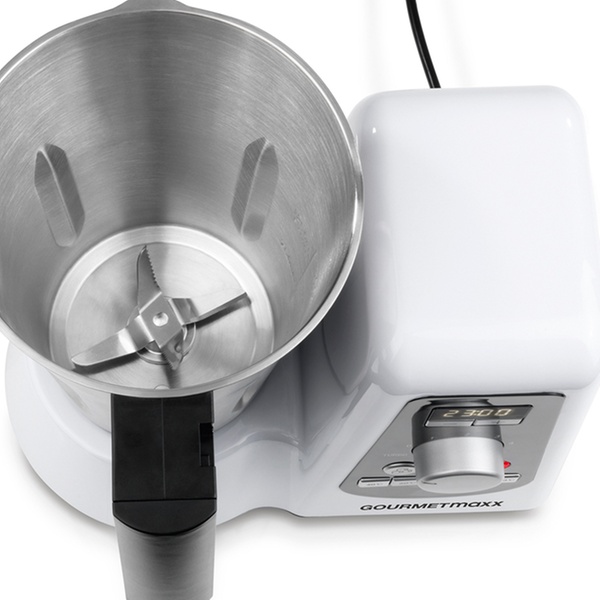 - Im Edelstahl-Mixbehälter mit 4-fach-Edelstahlklinge kann das Essen direkt zubereitet und warm gehalten werden