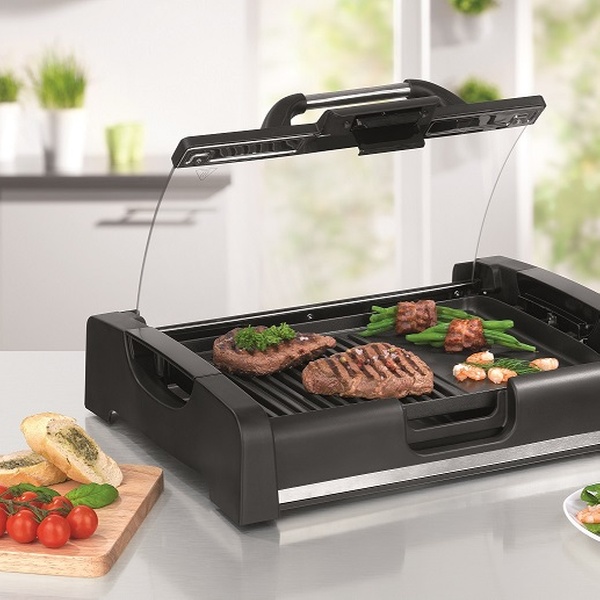 - Elektro-Grill mit Glasdeckel gegen Fettspritzer