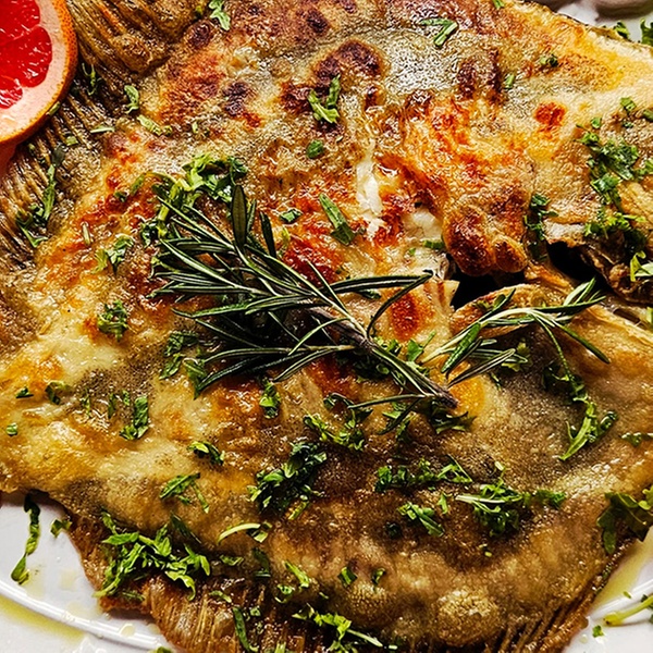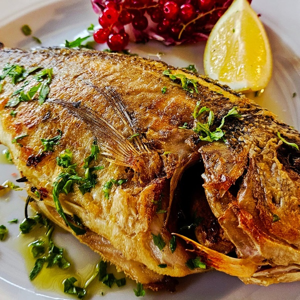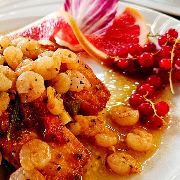 • Tagesfrischer Fisch (z. B. Dorade, Zander, Steinbutt) mit Champagner-Sauce und gegrilltem Gemüse