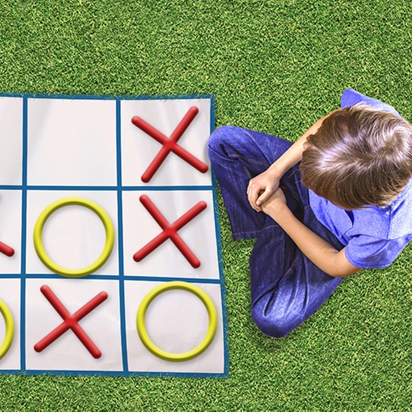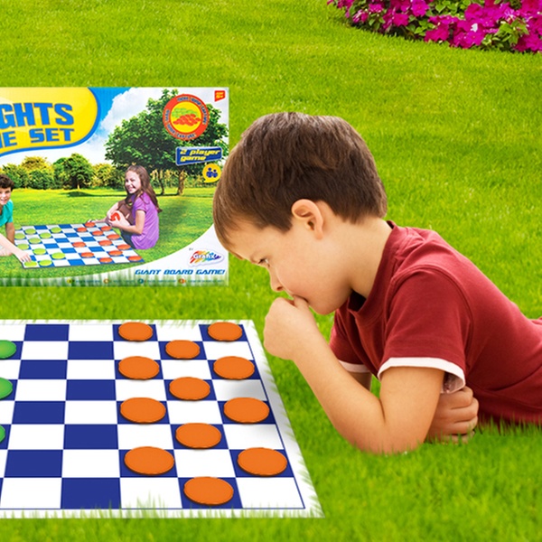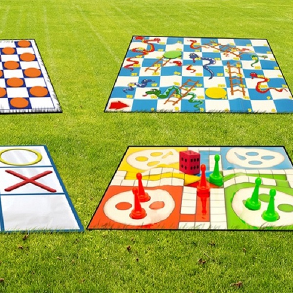 Klassische Brettspiele in robuster Verarbeitung auf großen Matten, geeignet für den Garten oder die Terrasse