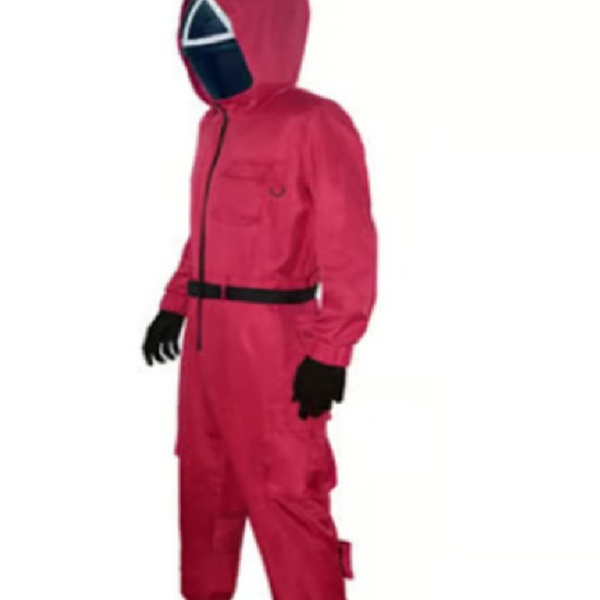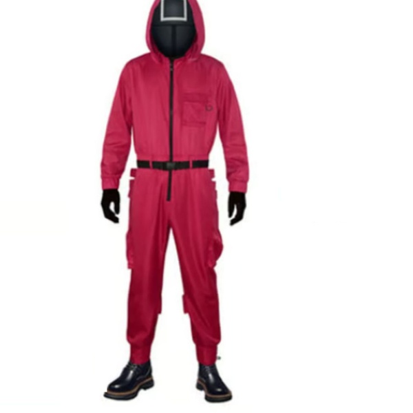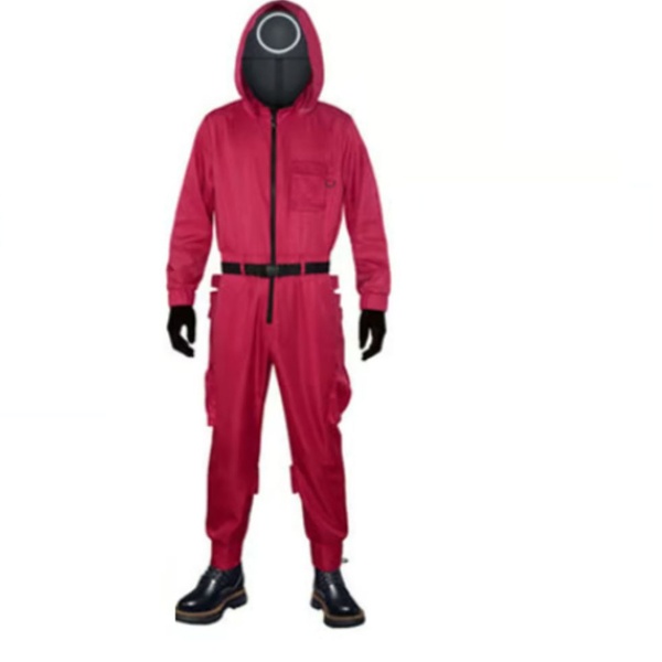 Mit diesem roten Jumpsuit und der charakteristischen Maske aus Squid Game verwandelst du dich schnell in einen der Guards – perfekt für Halloween oder Kostümpartys.