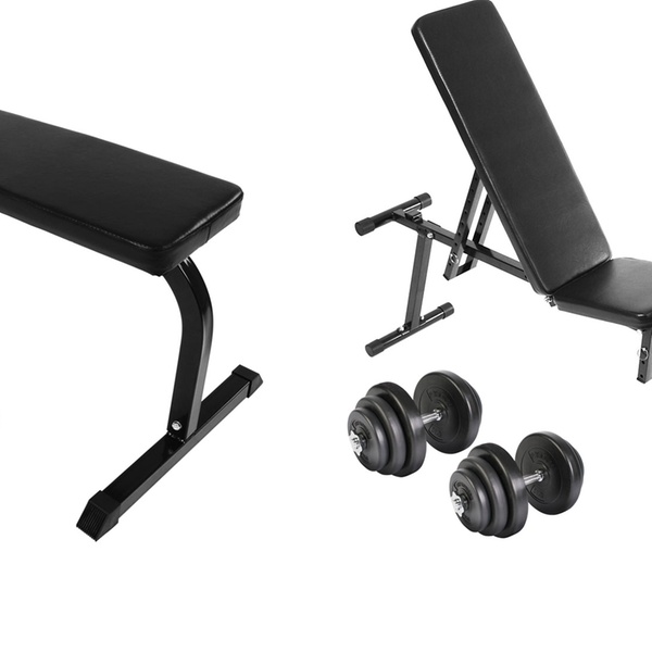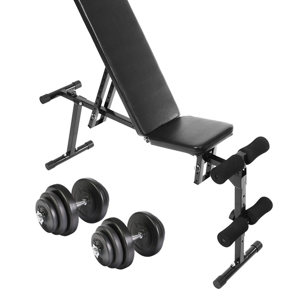 Eine Hantelbank, die mit einem Hanteln-Set mit Hantelscheiben geliefert wird, perfekt für ein Training zu Hause
