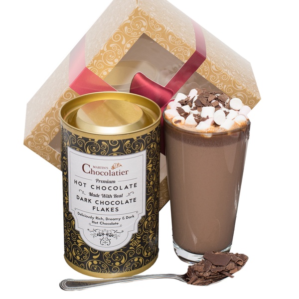 Ein luxuriöses Set mit Schokoladenflocken zur Zubereitung von heißer Schokolade dazu 1x Glasbecher & 1x Marshmallows