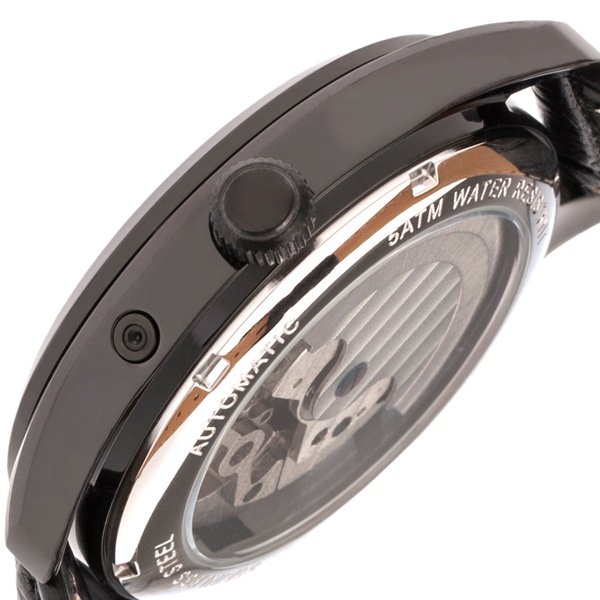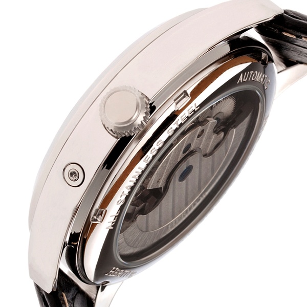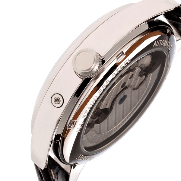 Diese modische Leder-Armband-Uhr mit Datum-Anzeige hat ein zusätzliches Fenster zur Beobachtung des Automaticwerks
