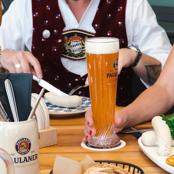 Herzhafte Weißwürste mit Breze und süßem Senf sowie ein halber Liter Bier