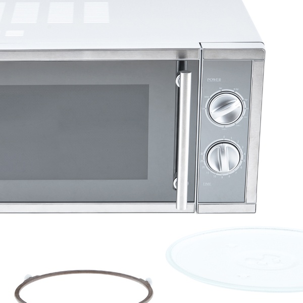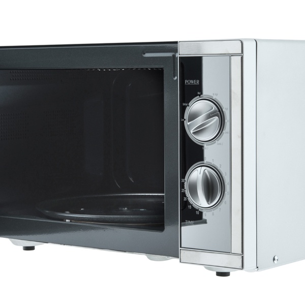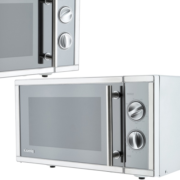 Hochwertige Edelstahl-Mikrowelle mit vollverspiegelter Tür und einem Garraumvolumen von 23 Litern.