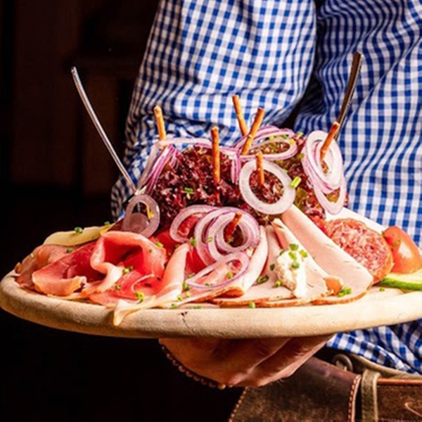 - Verschiedene Salate und Vorspeisen oder Beilagen, wie z.B. Knödel, Sauerkraut, Kartoffelgratin, Marktgemüse, Braten-Sauce