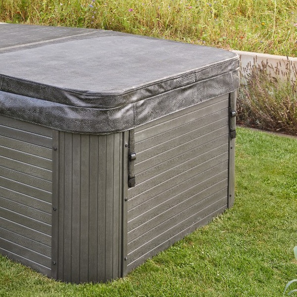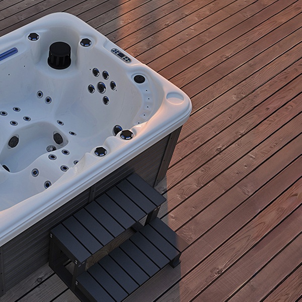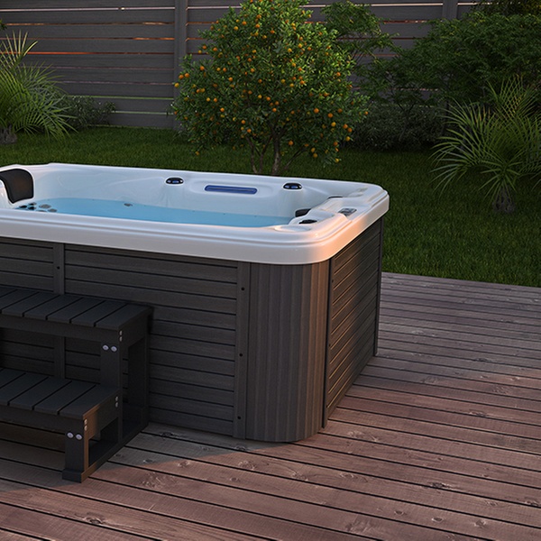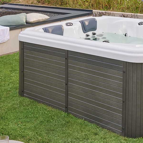 - Whirlpool für den Außenbereich mit dunkelgrauer Außenverkleidung aus WPC (naturfaserverstärkter Kunststoff)