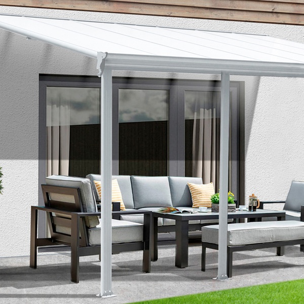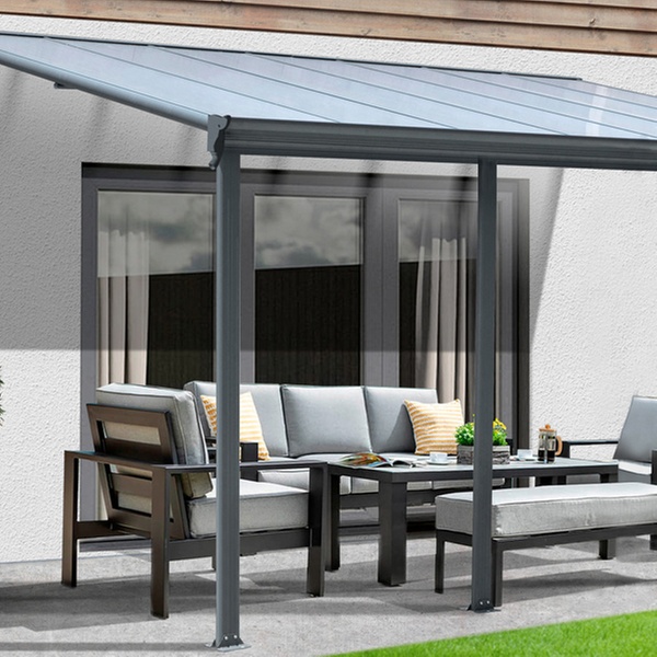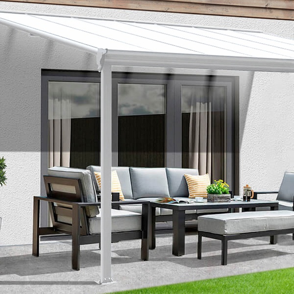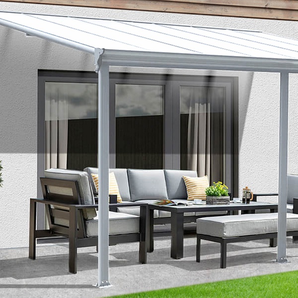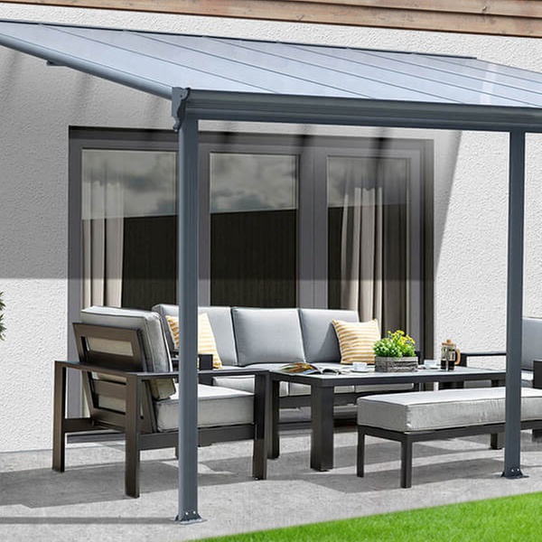 Diese elegante Terrassenüberdachung schützt vor UV-Strahlen und Wetter