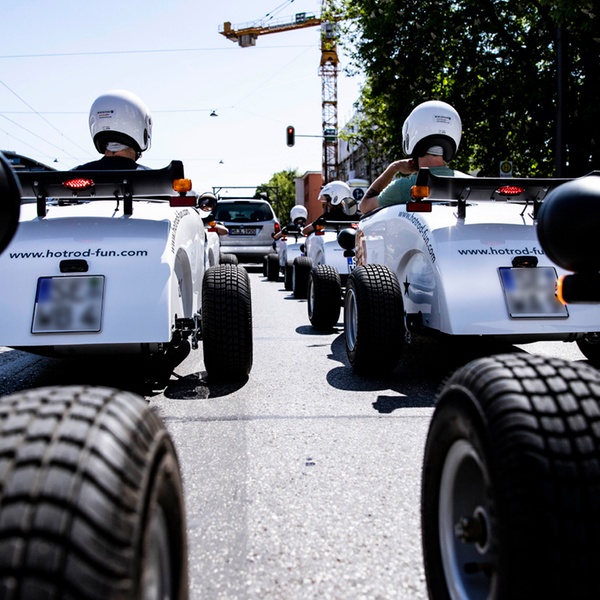 Von Weitem wirken die Hotrods ein wenig wie Seifenkisten. Wenn man sich jedoch in den kleinen Flitzer setzt, fühlt man sich fast wie in einem Sportwagen. Die handgefertigten Oldtimer-Nachbauten im Miniaturformat aus der Manufaktur Wenckstern können auf bis zu 88 km/h beschleunigen und bieten Fahrspaß pur im Stil der 20er- bis 40er-Jahre. Ob bei einer Fahrt in das Umland oder einer Tour durch München – die kundigen Guides lassen die Hotrod-Tour zu einem besonderen Erlebnis werden.