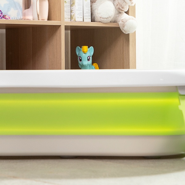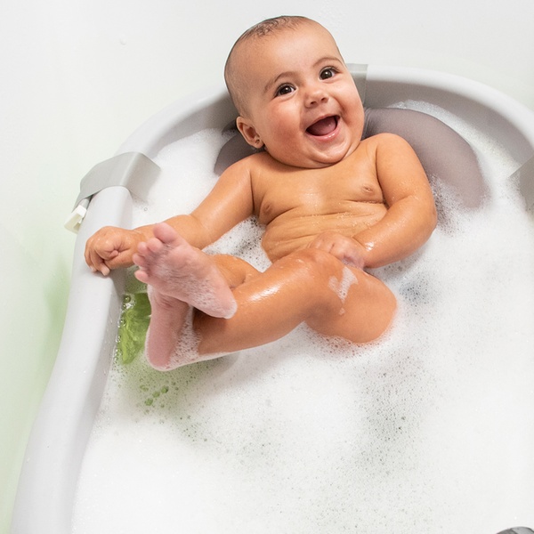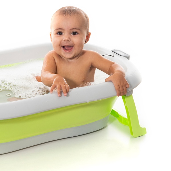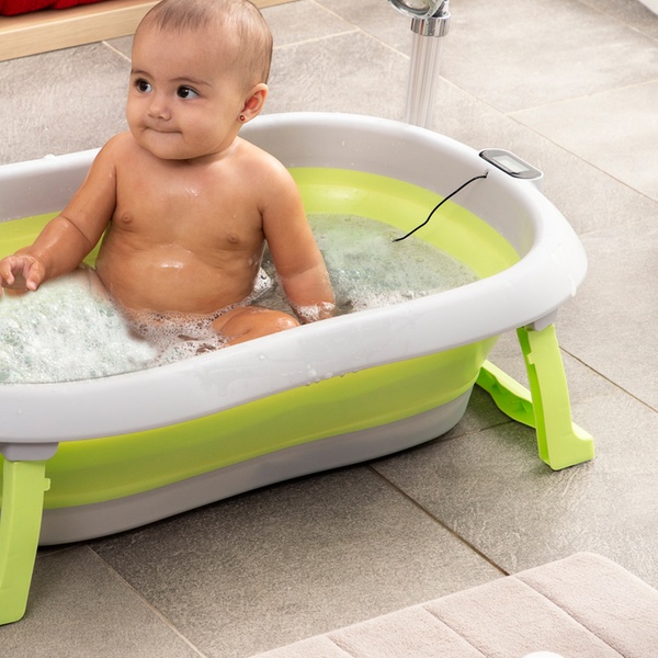 Diese faltbare Babywanne mit Thermometer, Kissen und Duschhalterung wächst mit und lässt sich platzsparend verstauen und transportieren