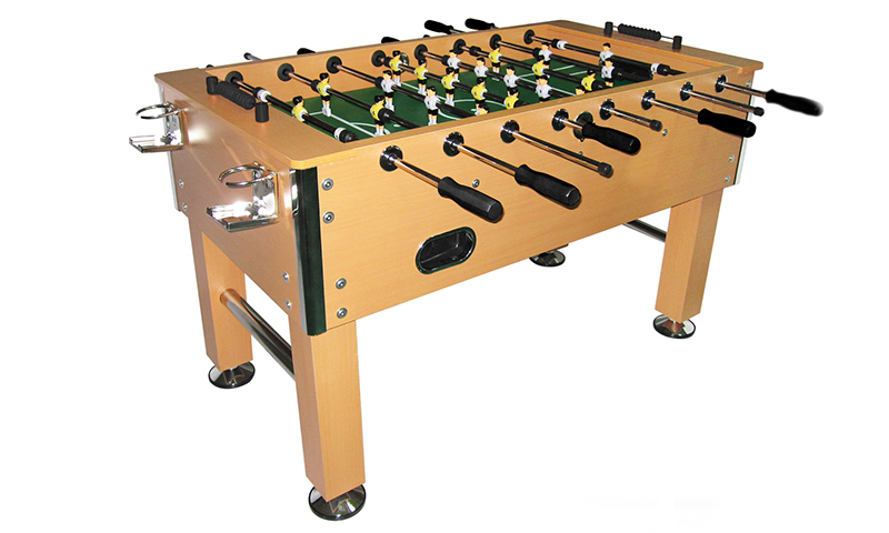 Kicken am edlen Tischkicker in Holz, Mahagoni oder Schwarz; massiver Tischfußball mit Getränkehalter und Balleinwurf in Chromoptik