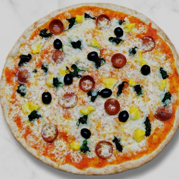 • Pizza Pollo Sucuk mit Sucuk, Hähnchen, Spinat, Oliven & Knoblauch