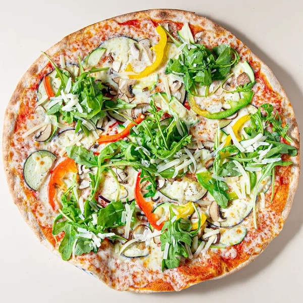• Vegane Pizza mit Aubergine, Zucchini, Paprika, Champignons, Rucola & Tomatensauce