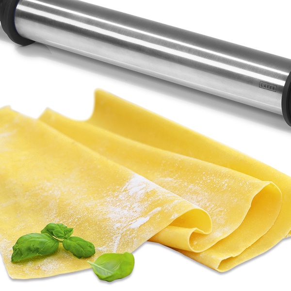 Edelstahl-Teigroller mit Distanzscheiben in 3 unterschiedlichen Größen und ergonomischen Griffen für eine komfortable Handhabung