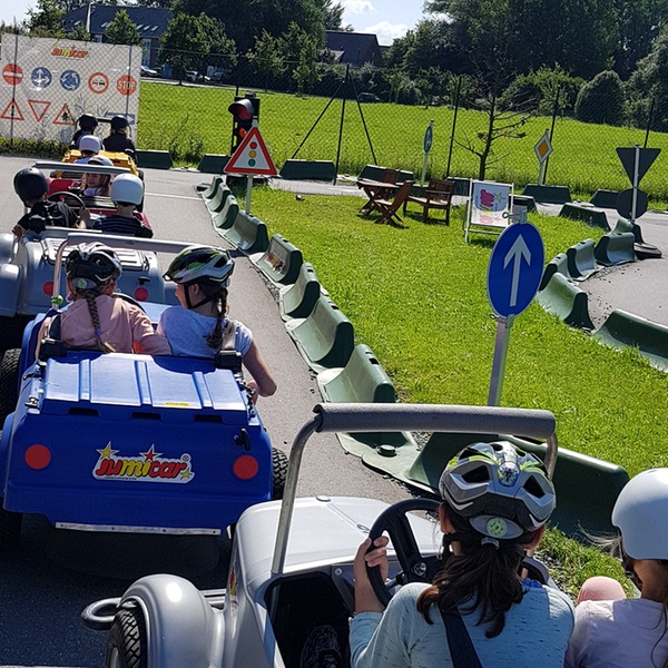 Praktische Fahrerfahrung für Kinder in echten Mini-Autos und über jeweils 10 Minuten im Straßenverkehr des Verkehrsgartens