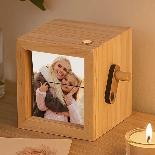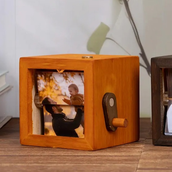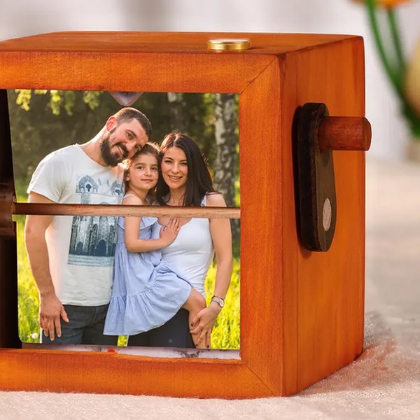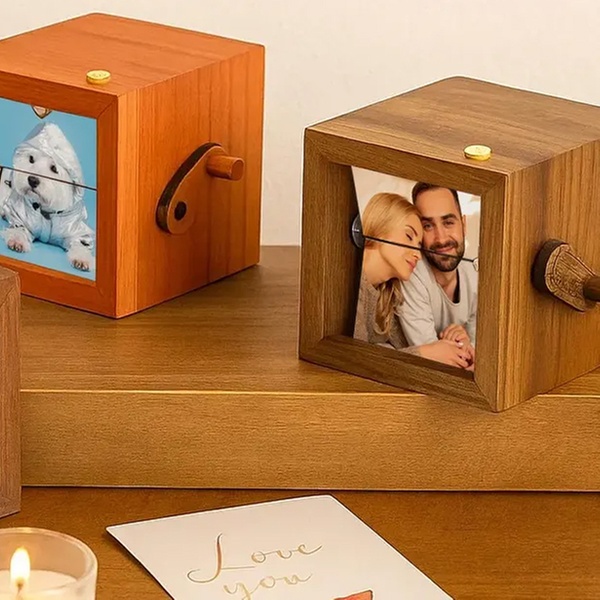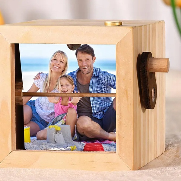 Ein handgefertigter Holz-Fotorahmen, der deine Lieblingsmomente auf ganz besondere Weise präsentiert. Die liebevoll eingearbeitete Kurbeltechnik gibt deinen Bildern Leben und macht sie greifbar – stilvoll und persönlich.