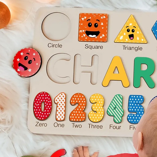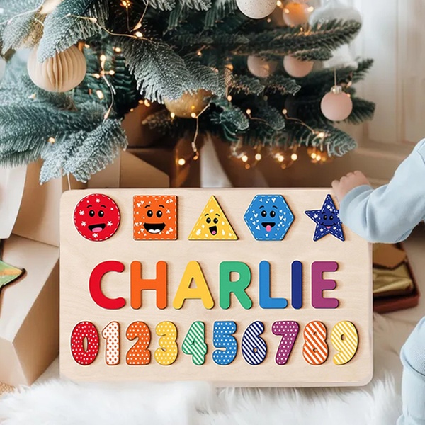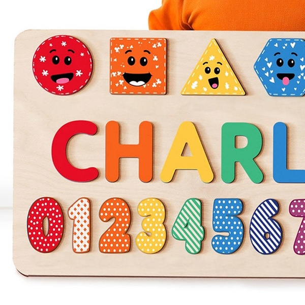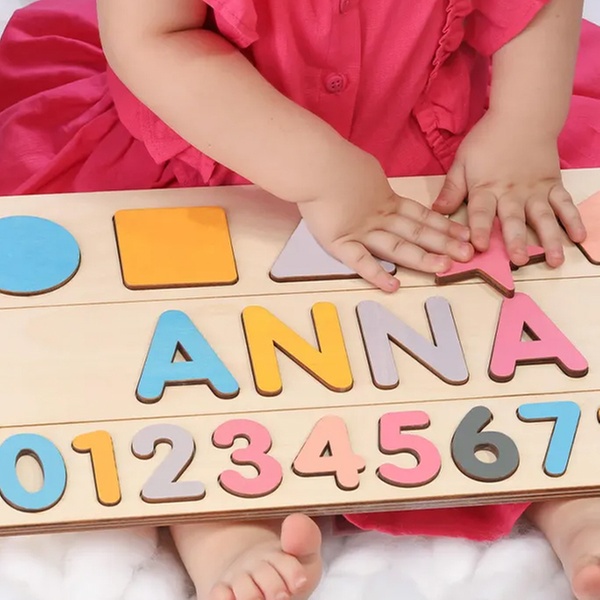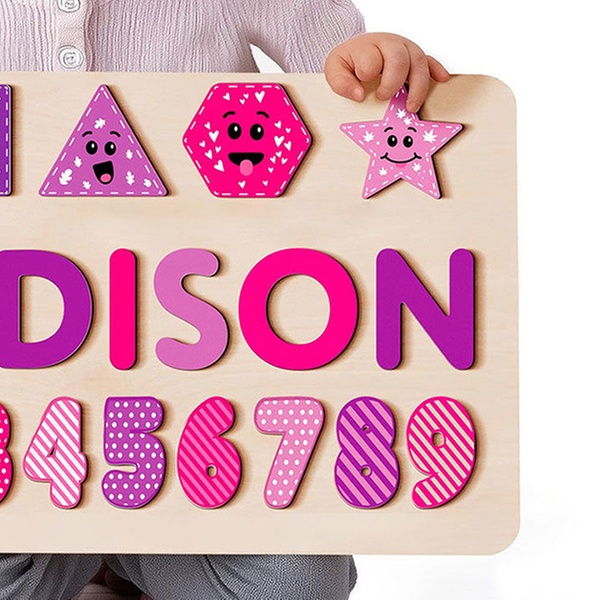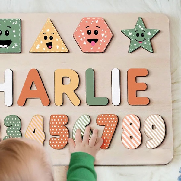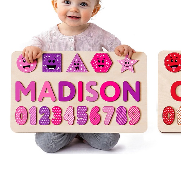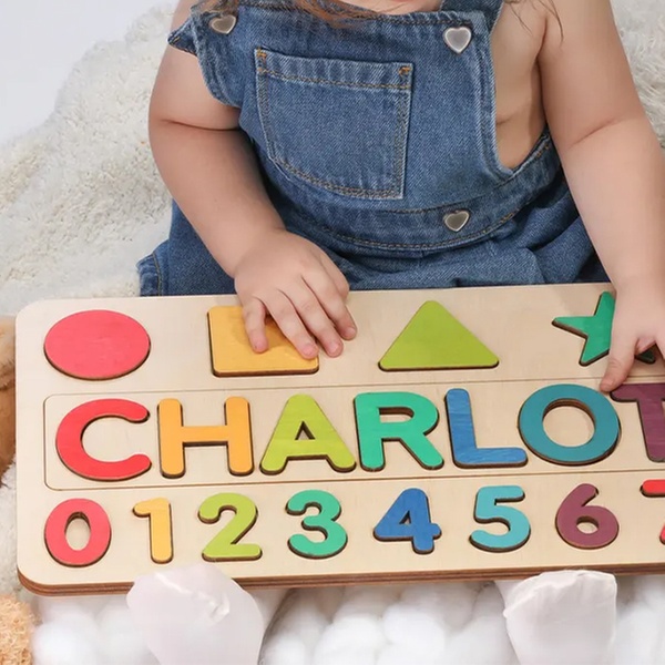 Puzzlebrett aus Holz mit verschiedenen Motiven und personalisiertem Namen, ideal als Babygeschenk und Spielzeug