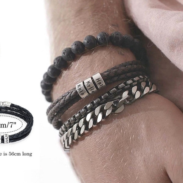 - Lederarmbänder mit gravierten Perlen oder Textplatten