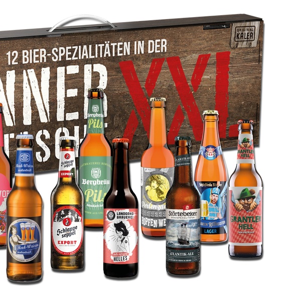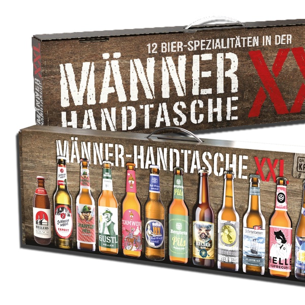 Diese Männerhandtasche enthält 12 Bierspezialitäten aus Deutschland und Österreich und ein Verkostungsheft mit Tipps zum Bier-Tasting